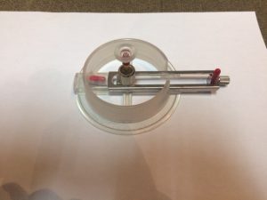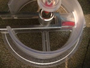 フロントヘッドをひっくり返して先ほど開けた画鋲の穴にサークルカッターの中心のピンを合わせて差し込みます。ここら辺から丁寧にやらないとフロントヘッドを無駄にしてしまいます。