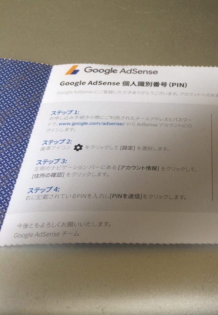 報酬額が1000円に達すると住所確認が行われます。こちらの手紙を開封すると「PINコード」が記載されています。その「PINコード」をアドセンスの管理画面で入力すると住所確認完了となります。