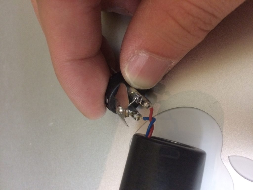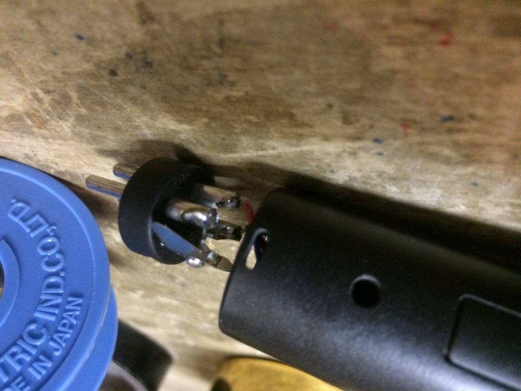 これくらい引き抜いたら確認するのが、親指が触れている箇所のハリガネみたいな部品です。ここがハンダから割れてしまっている場合は接触不良を起こしています。それによりマイクコネクタをクネクネした時に「ジー」というノイズを発生させています。この箇所を半田ごてで再度付け直すことにより完全に復活します。ノイズフリーです。