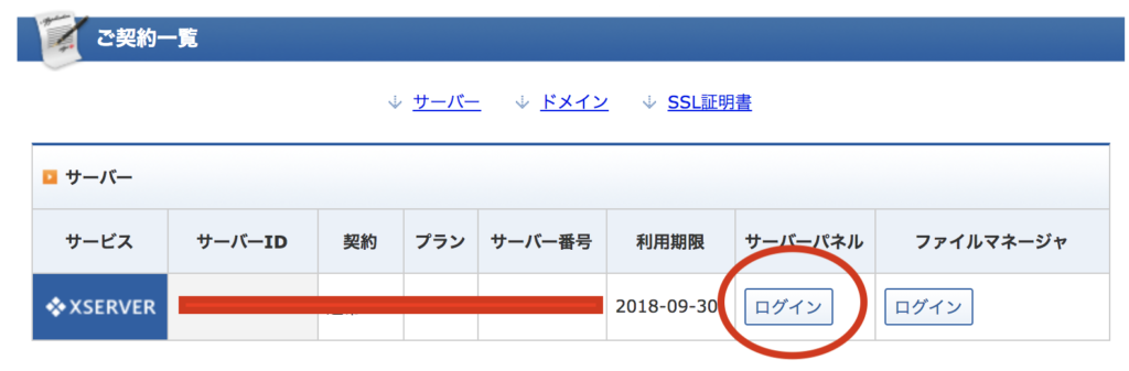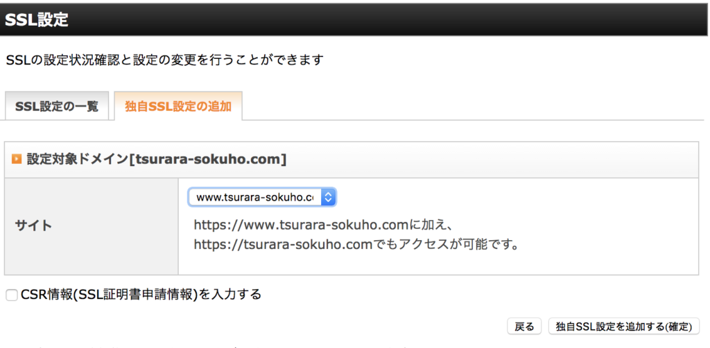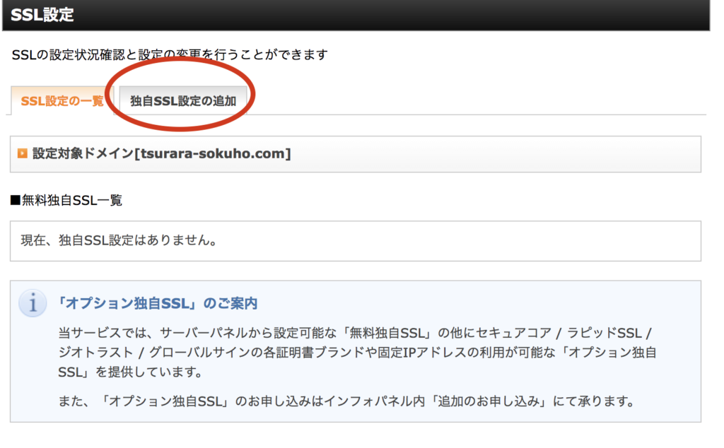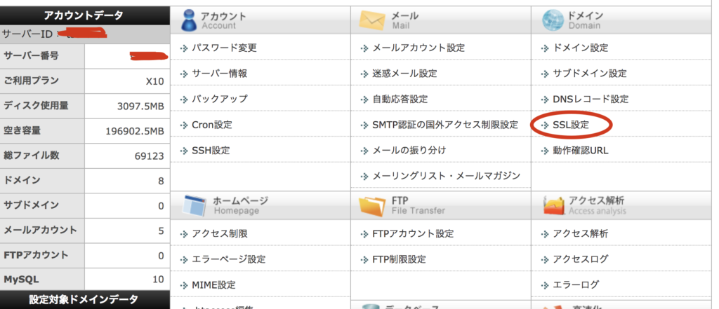 次にドメイン設定の項目のSSL設定の項目を選びます。設定したいドメインを選びSSL設定画面に入ります。