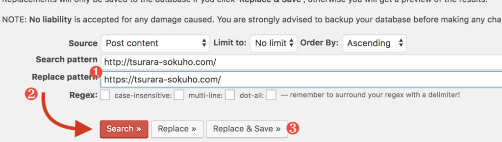 Search Regexとは一括置換ツールです。httpと打ち込まれている部分を検索してhttpsに置き換えるために使います。